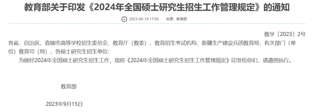 2023年9月15日,教育部关于印发《2024年全国硕士研究生招生工作管理规定》的通知,其中提及到:“大力推进按一级学科命题和题库命题。鼓励招生单位选用全国统一命题科目试卷...”