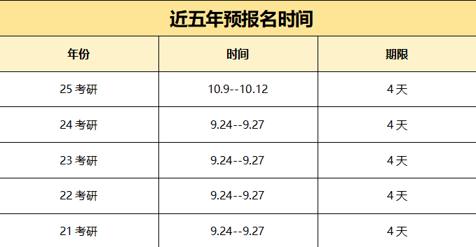 首先,咱们先看看近五年的预报名时间:四天的总期限并没有变化,而今年是五年以来首次推迟。
